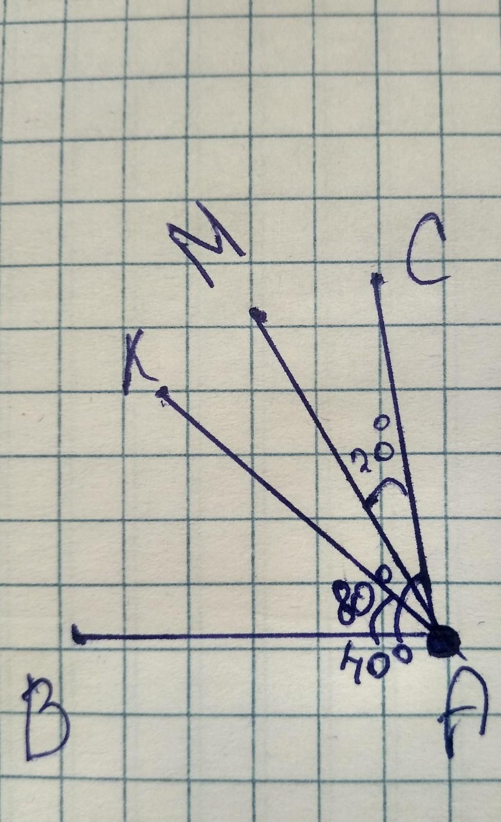 угол KAC=40° т.к АК это биссектриса ВАС.