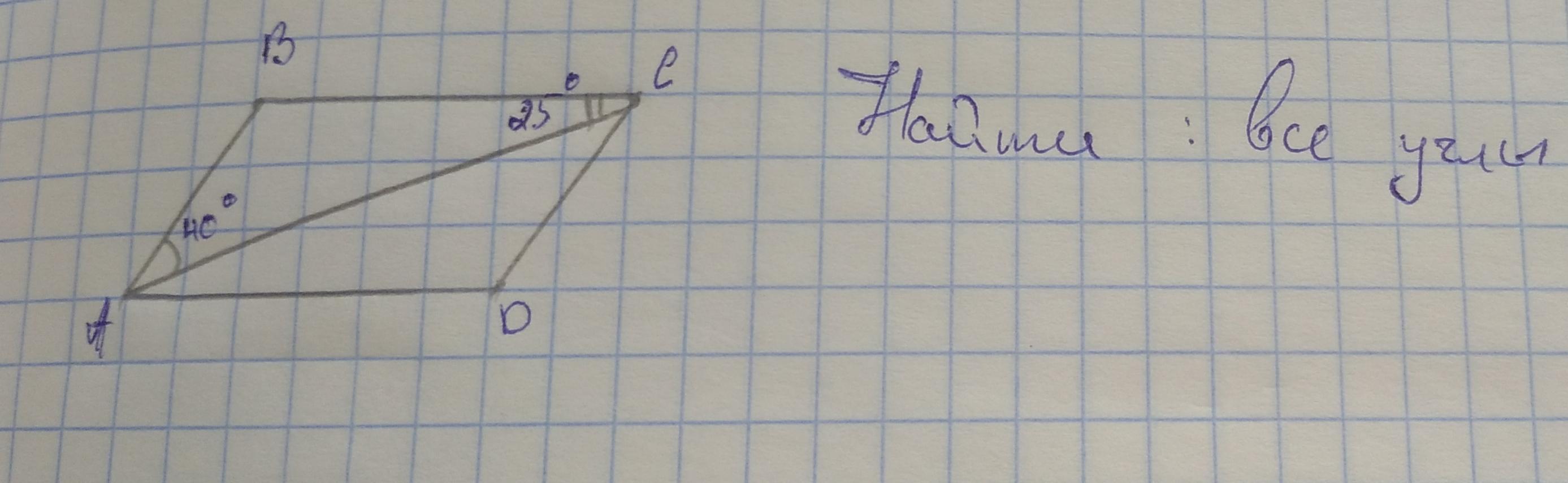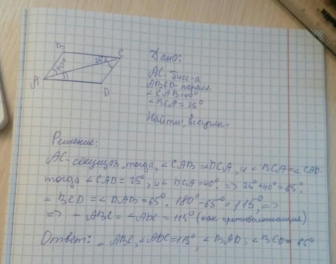 ABCD-параллелограмм, AC-биссектриса, угол CAB=40°, угол BCA=25°. Найти: все углы