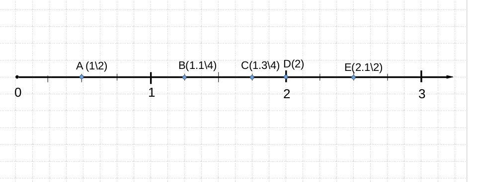 начертите координатный луч, за еденичный отрезок примините отрезок длиной 4 см. отметьте на нем точки: а (1/2) , б ( 1 . 1/4), с (1 . 3/4), д (2), е (2 . 1/2)