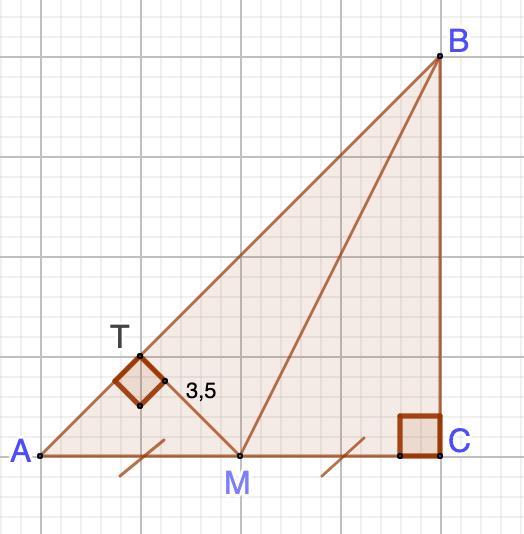 В равнобедренном прямоугольном треугольнике ABC с прямым углом C проведена медиана BM. Из точки M к гипотенузе восстановлен перпендикуляр MT . Найдите длину гипотенузы AB, если MT=3,5 .