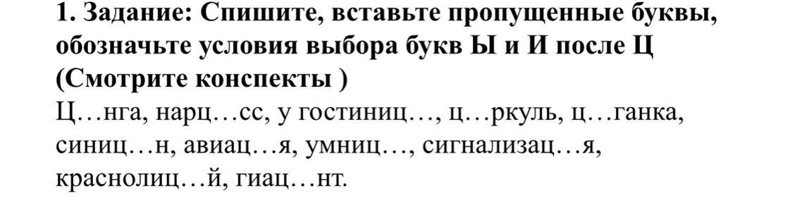 Спишите, вставьте пропущенные буквы, обозначьте условия выбора букв Ы и И после Ц (Смотрите конспекты )