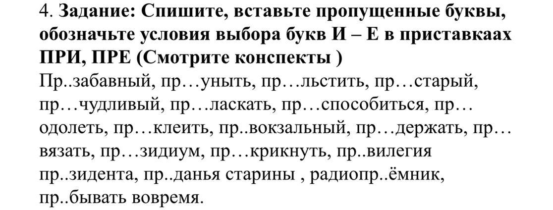 4. Задание: Спишите, вставьте пропущенные буквы, обозначьте условия выбора букв И – Е в приставкаах ПРИ, ПРЕ (Смотрите конспекты )