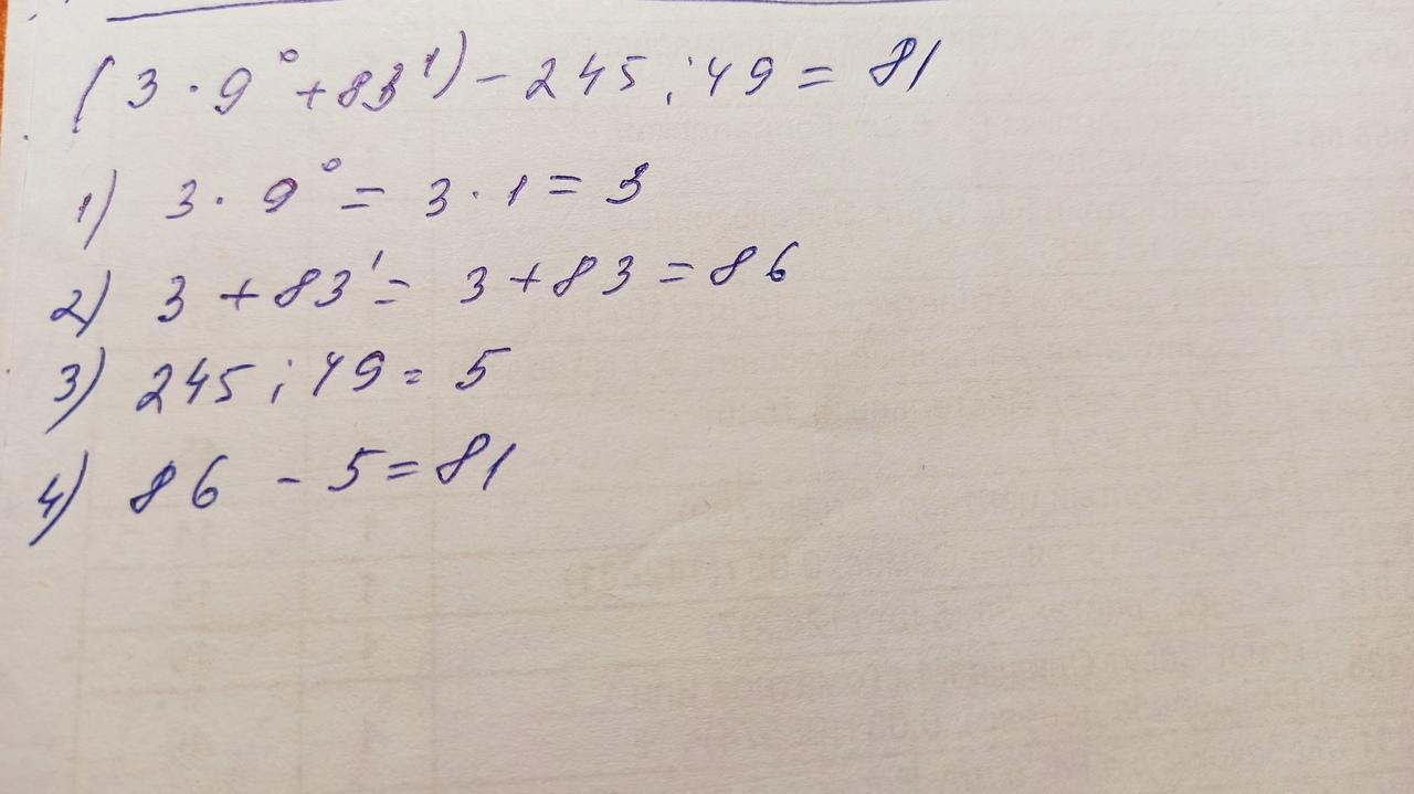 Решить пример по действиям чтобы получить 81. ( 3×9°+83 в первой степени )-245:49=81