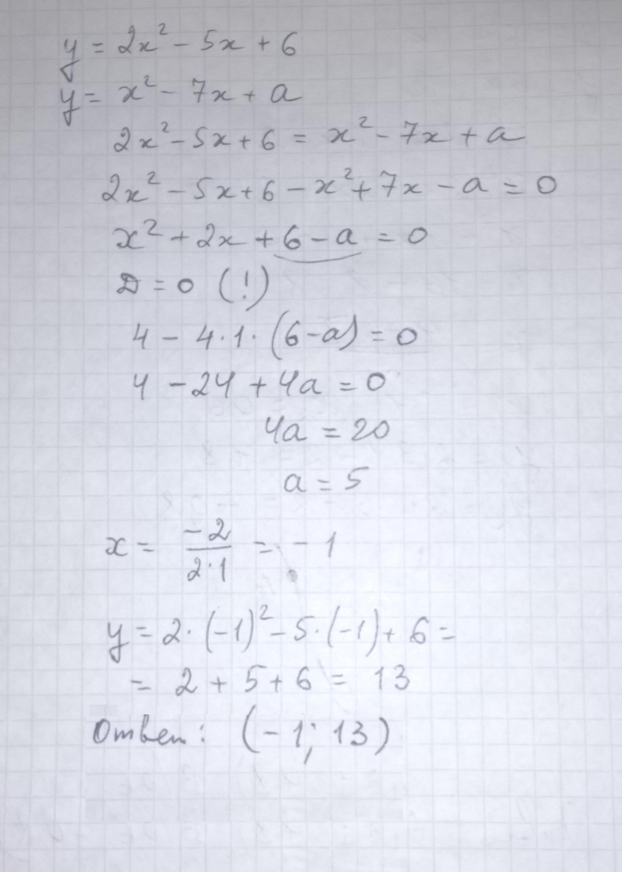 При каком значении а графики функций у=2х^2-5х+6 и у=х^2-7х+а имеют одну общую точку? Найдите координаты этой точки