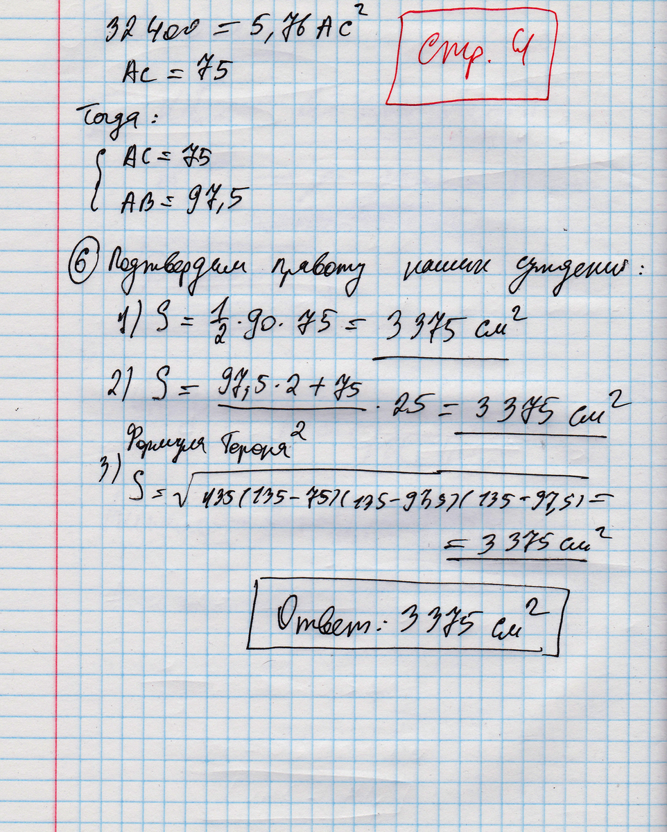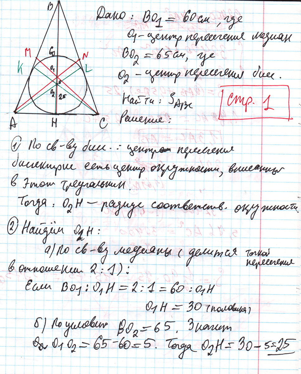 в равнобедренном треугольнике вершина, которая лежит против основы, отдалена от точки пересечения медиан на 60 см, а от точки пересечения биссектрис на 65 см Найти площадь треугольника.