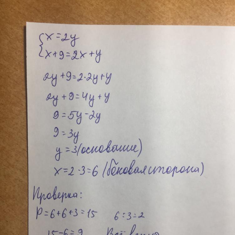 Боковая сторона равнобедренного треугольника в 2 раза больше основания и на 9 см меньше периметра треугольника Найдите длину основания треугольника