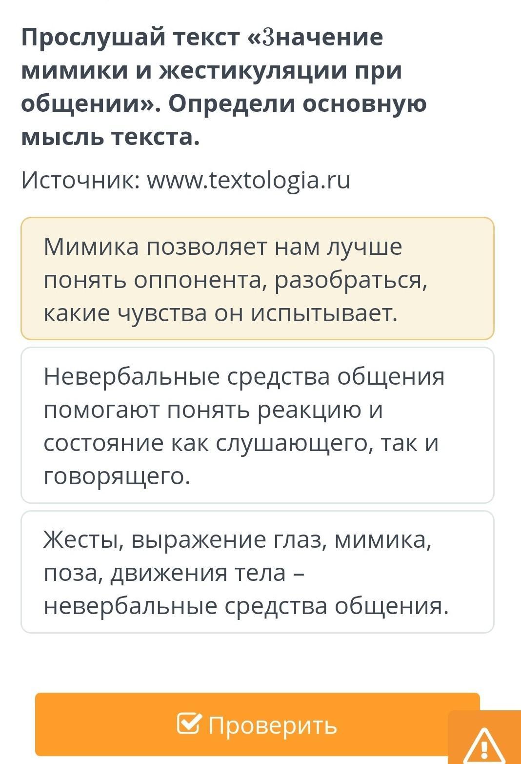 Прослушай текст «3нaчeниe мимики и жecтикyляции пpи oбщeнии». Определи основную мысль текста.