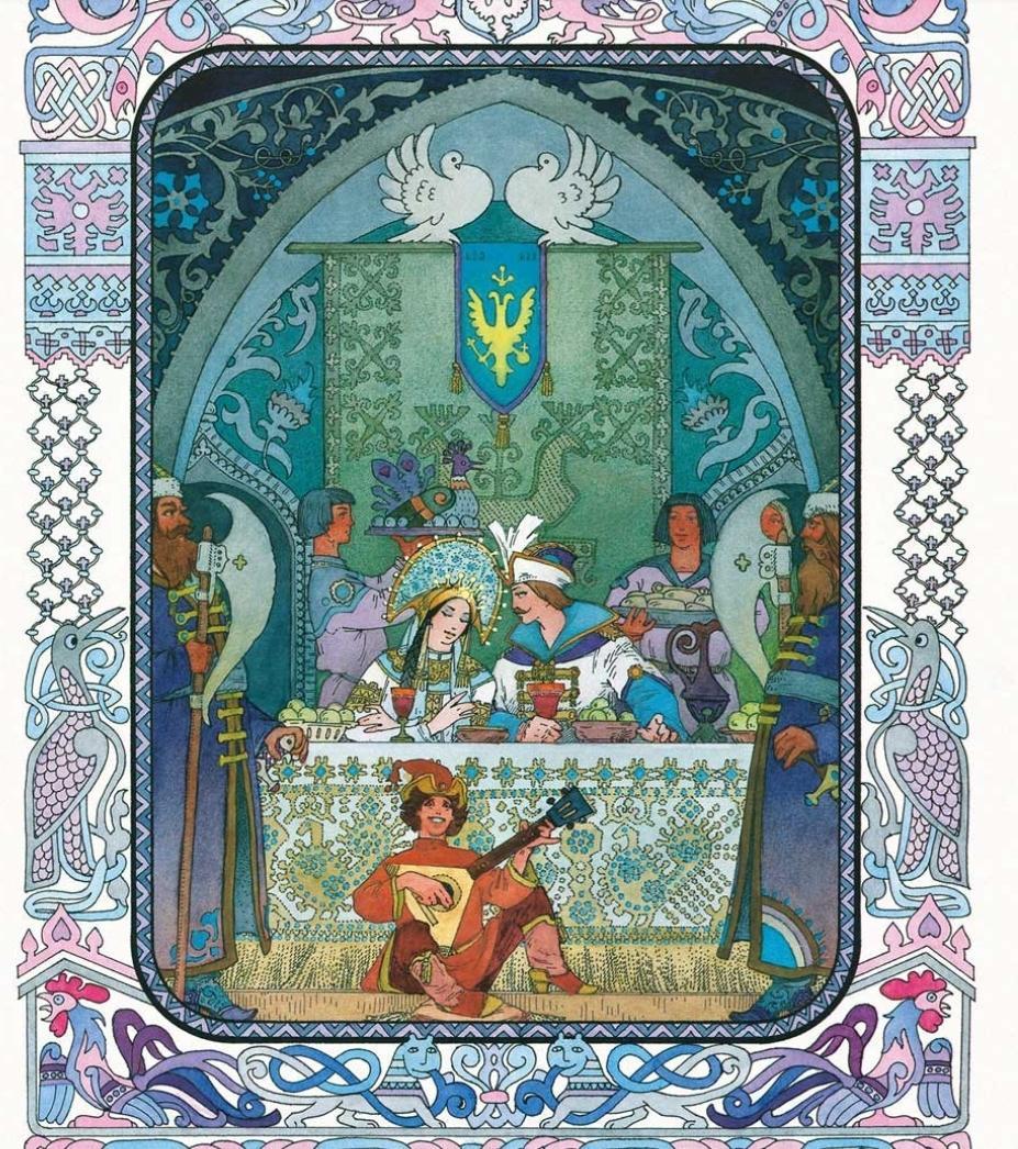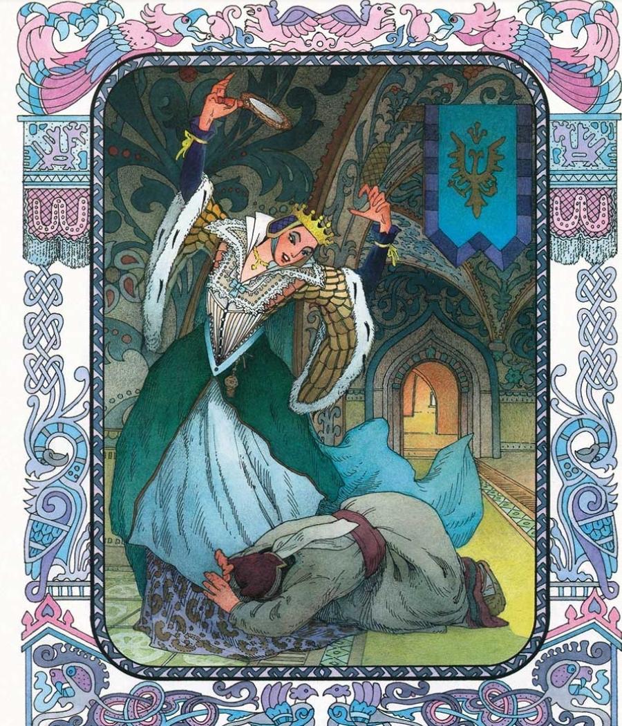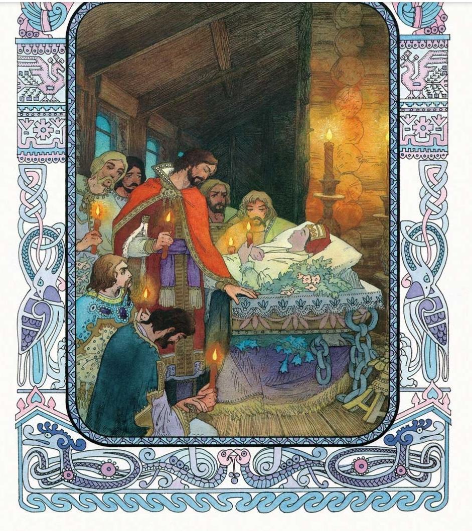 Рассмотрите иллюстрации Вячеслава Назарука к сказке А.С. Пушкина. Какие эпизоды "Сказки о мёртвой царевне и о семи богатырях" запечатлел художник? Найдите к каждой иллюстрации строки из сказки, выразительно их прочитайте. Удалось ли художнику передать образы героев?