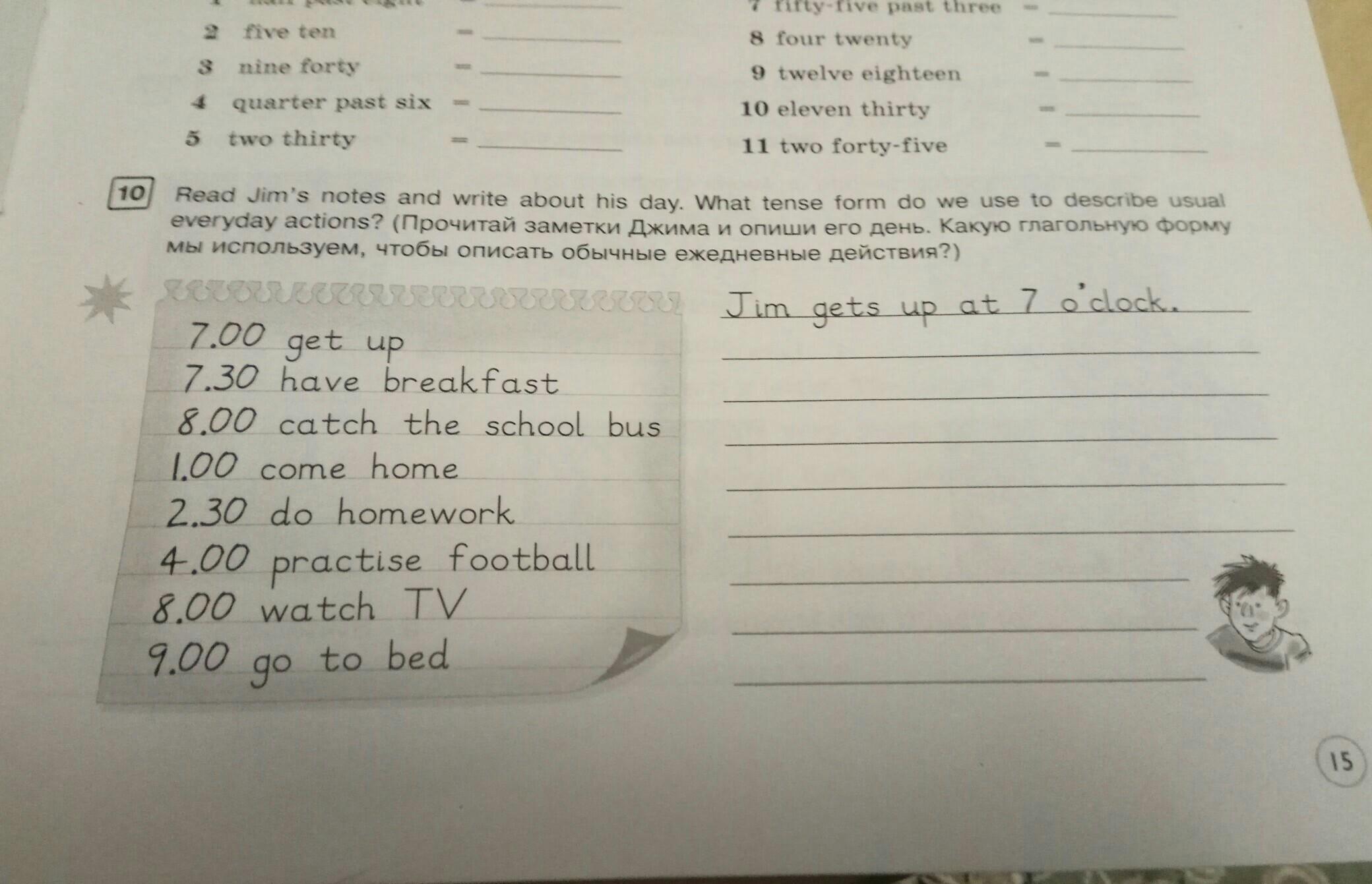 в 7:00 Джим просыпается, 7:30 он завтракает в 8:00 он идёт в школу 1:00 он идёт домой в 2:30 делает домашнее задание в 4:00 он практикует футбол в 8:00 он смотрит телевизор в 9:00 он идёт спать