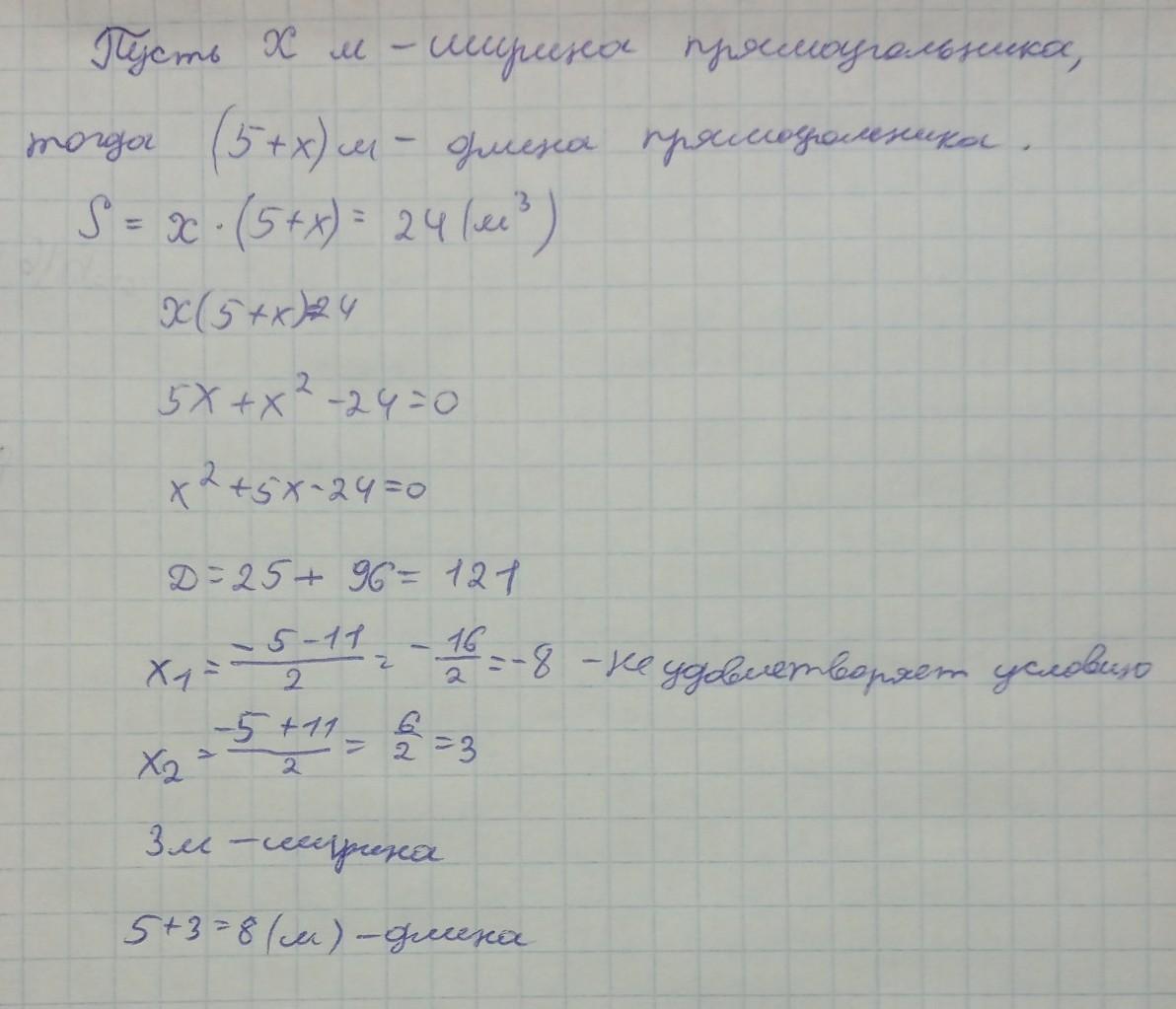 Ширина прямоугольника на 5 м меньше длины, а площадь равна 24 м2. Найди ширину и длину прямоугольника