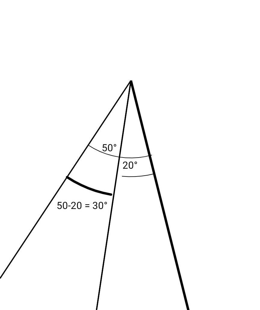 Тогда угол, образованный не-общими сторонами углов в 20° и 50° будет равен разности 50° и 20°: