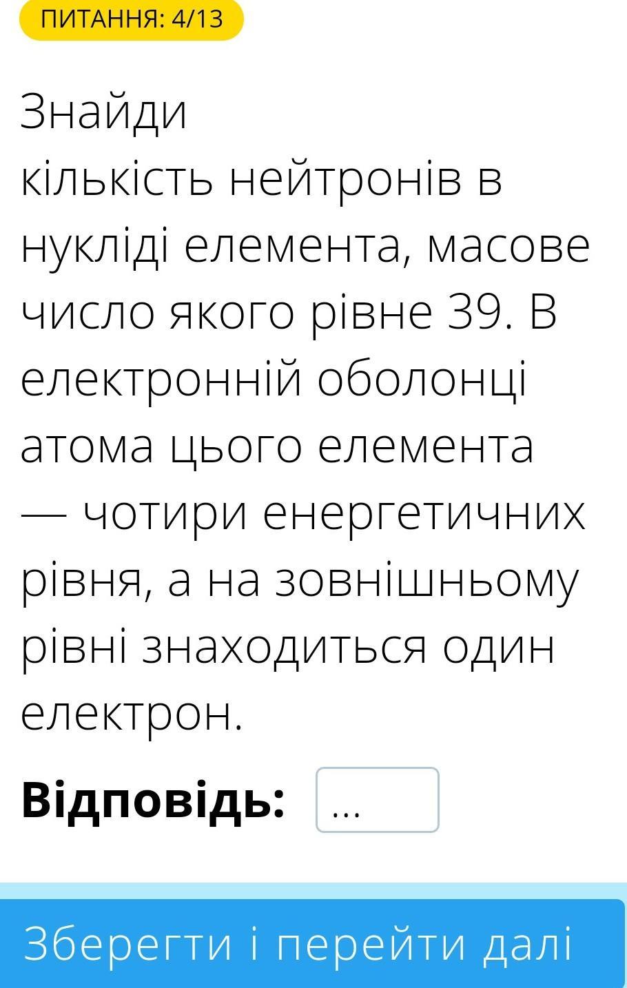Массовое число 39.Протонне число елемента Калію дорівнює 19. Це означає, що заряд ядра його атома +19, тобто в ядрі міститься 19 протонів. Оскільки відносна атомна маса Калію — 39, то в ядрі його атома міститься 39 - 19 = 20 нейтронів.