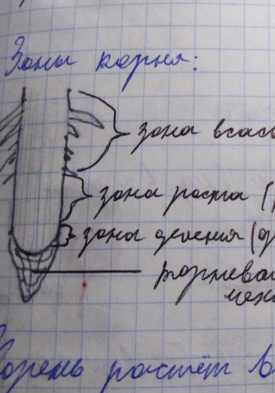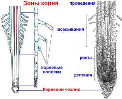 У корня есть 5 зон: зона проведения, зона всасывания, зона роста (растяжения), зона деления и корневой чехлик.