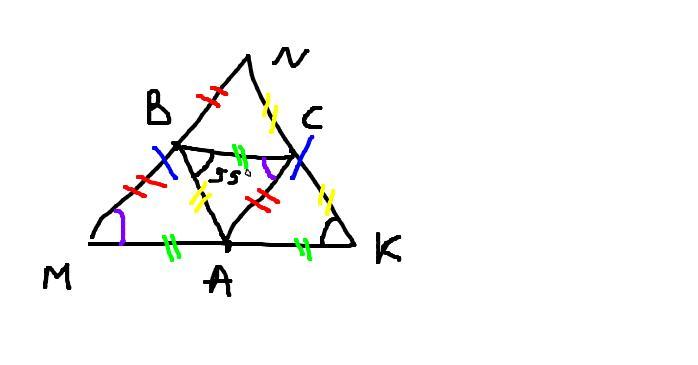 ABC - серединный треугольник, его стороны равны половинам сторон треугольника MNK, а углы равны углам треугольника MNK, лежащим напротив них. Получается, <ABC = <MKN, а <ACB = <NMK