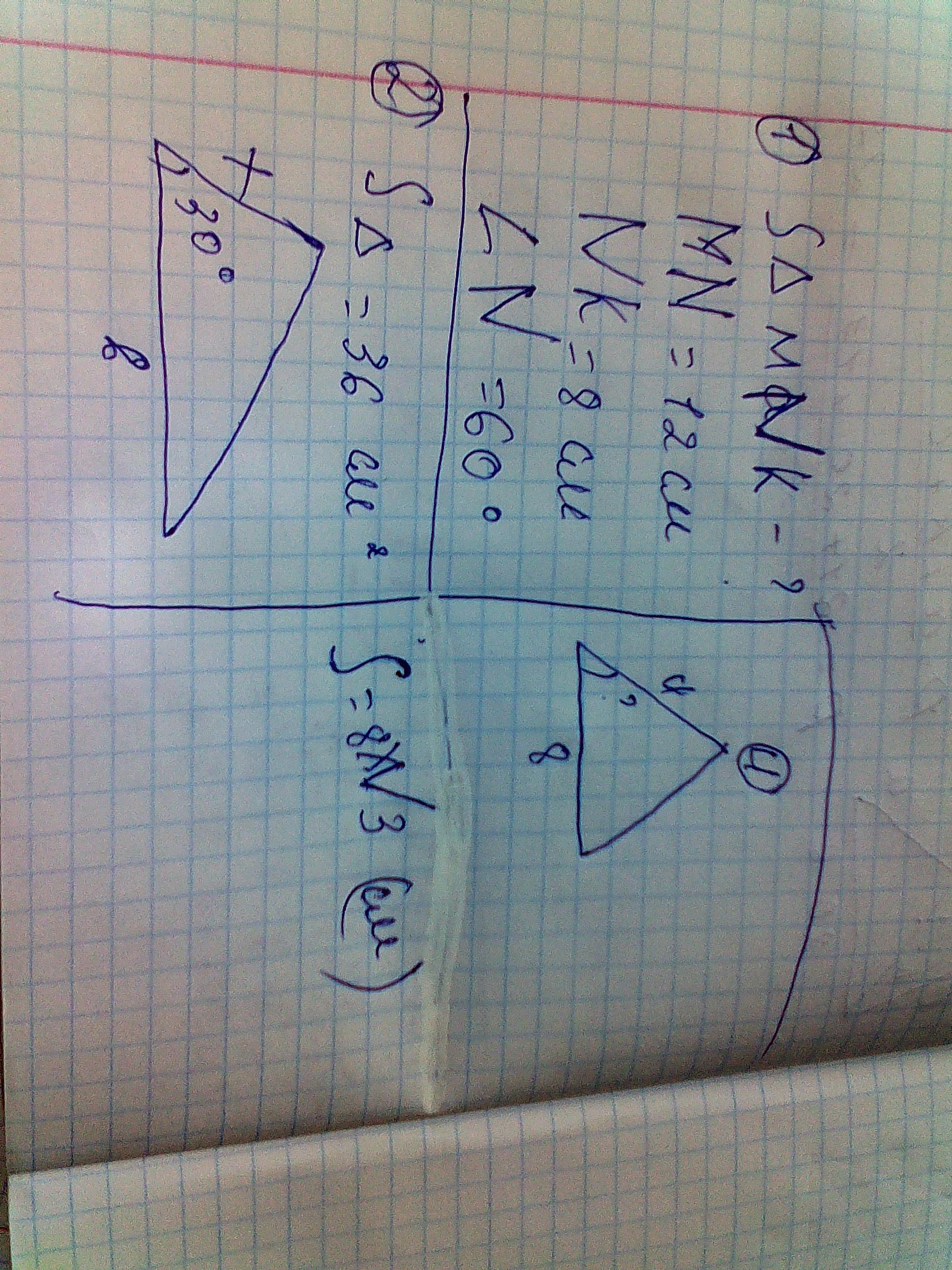 1) S(ΔMNK) = (MN*NK*sin<N)/2 = (12*8*/2)/2 = 24