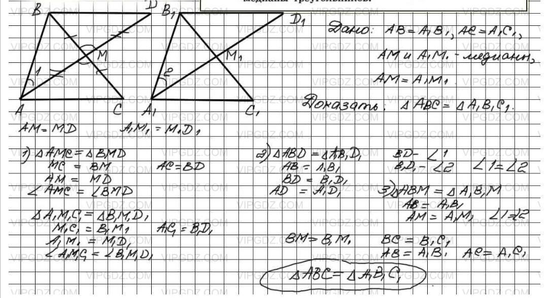 Даны два треугольник ABC и A1B1C1. Известно что АВ= A1B1, АС= А1C1. Медианы АМ и A1М1 тоже равны. Докажите что треугольники ABC и A1B1C1 равны