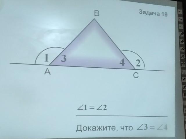 оскільки кут один суміжний з кутом 3 то він рівний куту 4 котрий суміжний з кутом 2 а кут 1 та 2 рівні отже вони кут 3-4 рівнів