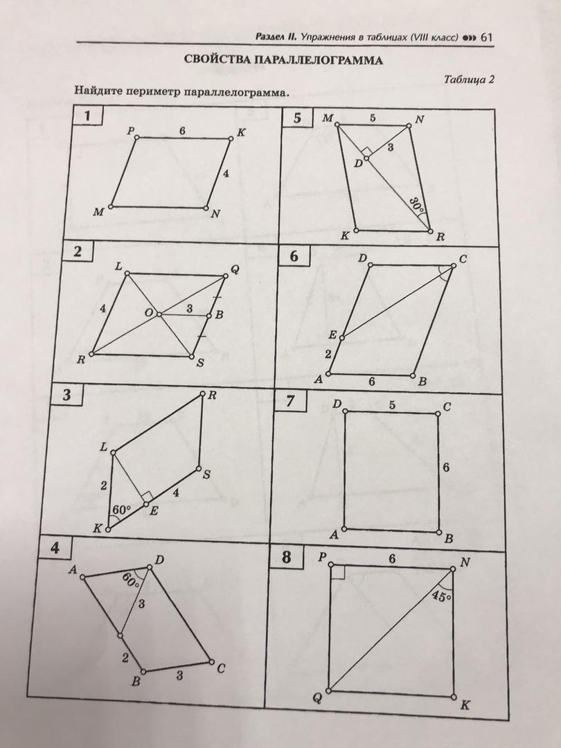 Свойства параллелограмма ( таблица 3 ) 1.) угол N=K=100 градусов угол M = 360 - 200 : 2 = 80 градусов ответ : N=100 K=100 M=80 P=80 2.) угол DEC = 55 как внутрешние разносторонние EDC=55 как углы при основании кут C= 180-(55+55) = 70 градусов угол D=110 ответ: A=70 B=110 C=70 D=110