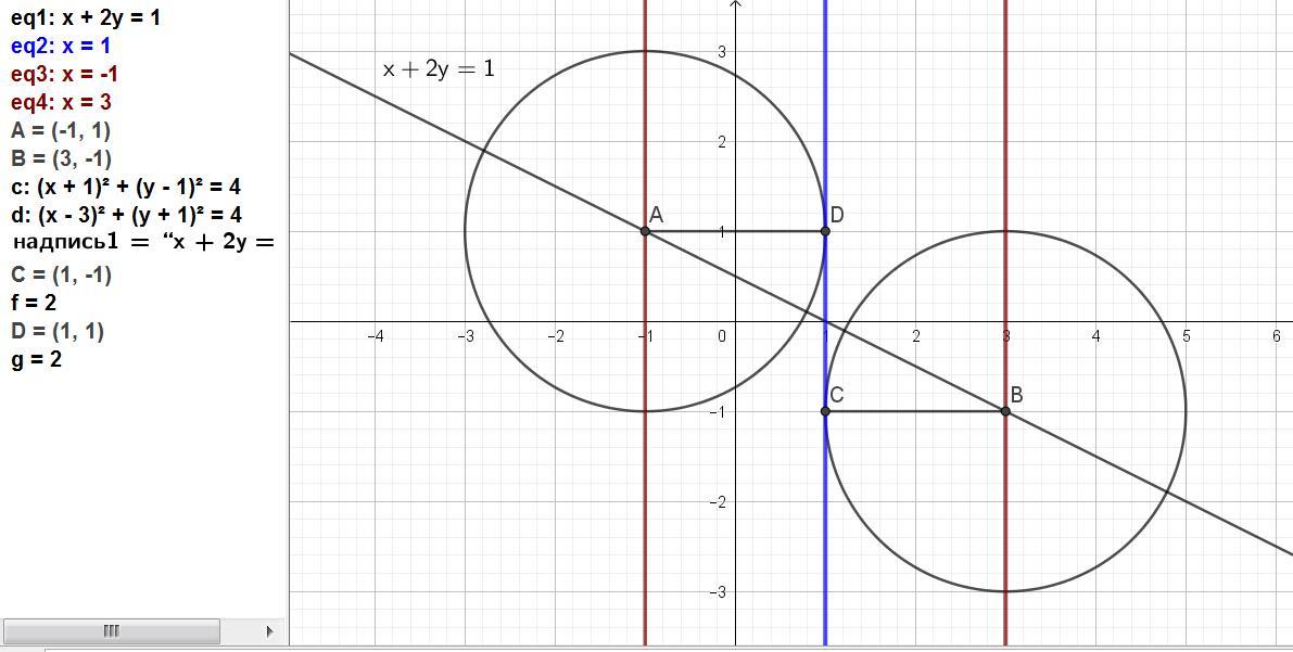 Находим координаты центров окружностей как точки пересечения заданной прямой x+2y-1=0 и двух найденных х = -1 и х = 3.
