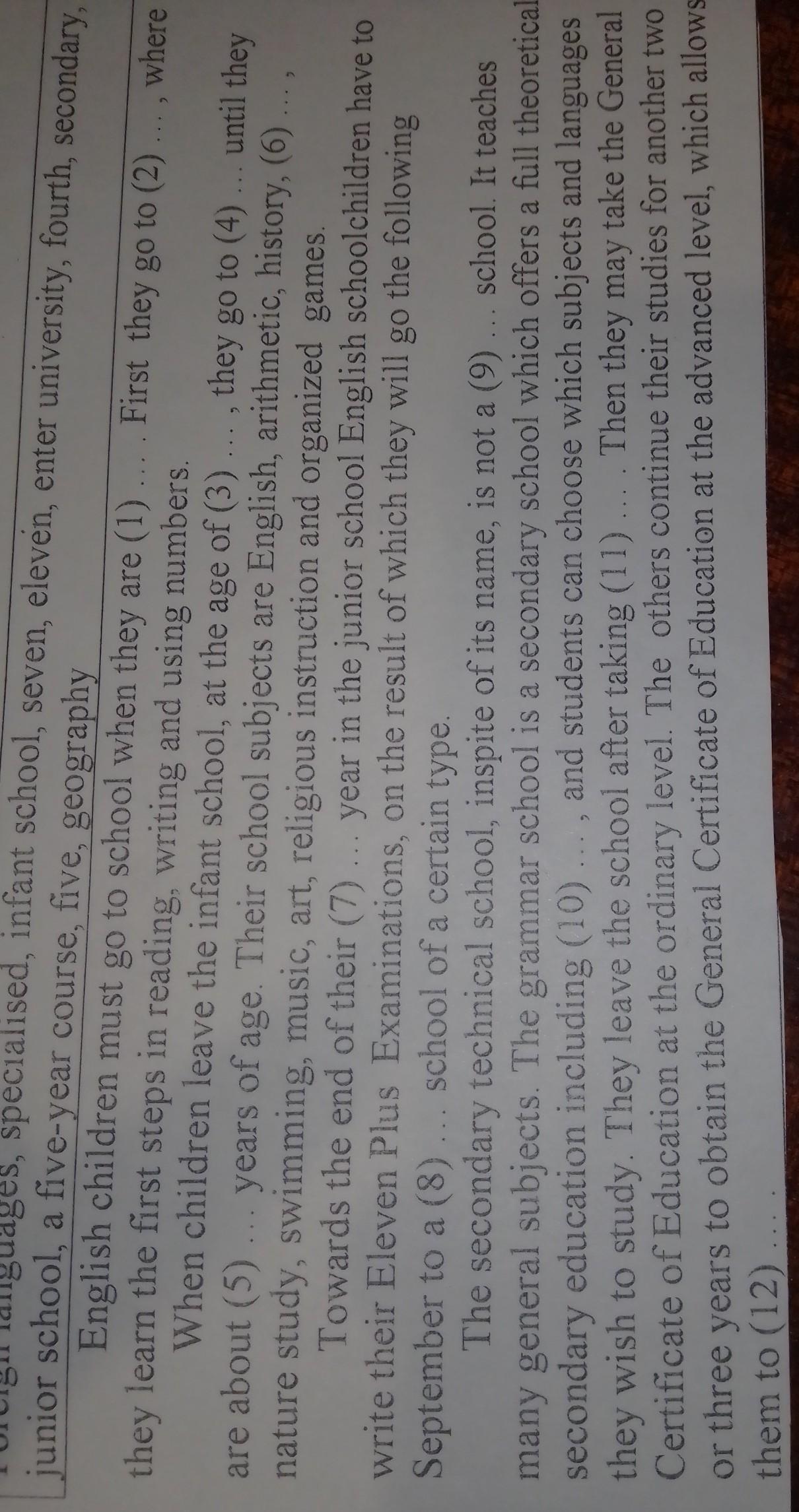 Ответ: 1) five, 2)infant school, 3)seven, 4)junior school, 5)eleven, 6)geography, 7)fourth, 8)secondary, 9)specialized, 10)foreign languages, 11)a five-year course, 12)enter university
