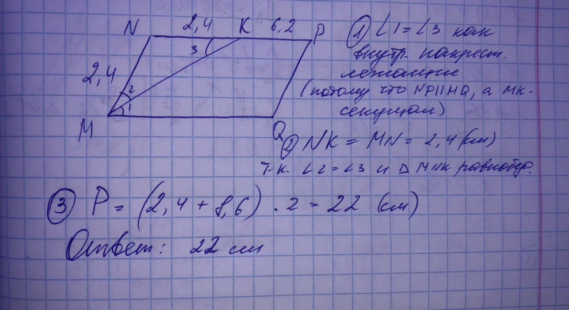 Бісектриса кута М паралелограма MNPQ перетинає сторону NP в точці K при цьому NK=2,4 см KP =6,2 см . Обчислити периметр паралелограма