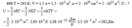 Какова внутренняя энергия идеального газа, находящегося в закрытом сосуде вместимостью 1,5 л при комнатной температуре, если концентрация молекул газа равна 2∙1019 см-3?