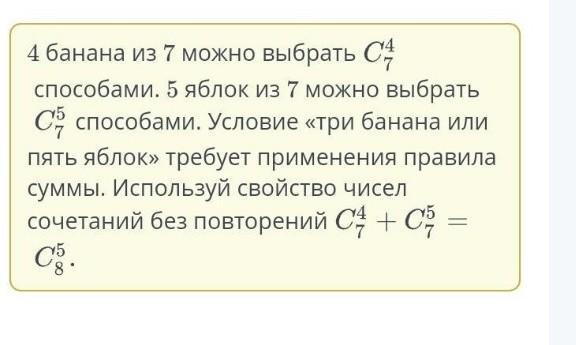 Требуется выбрать 4 банана и 5 яблок укажи какими способами это можно сделать если имеется 7 различных бананов и 7 различных яблок?