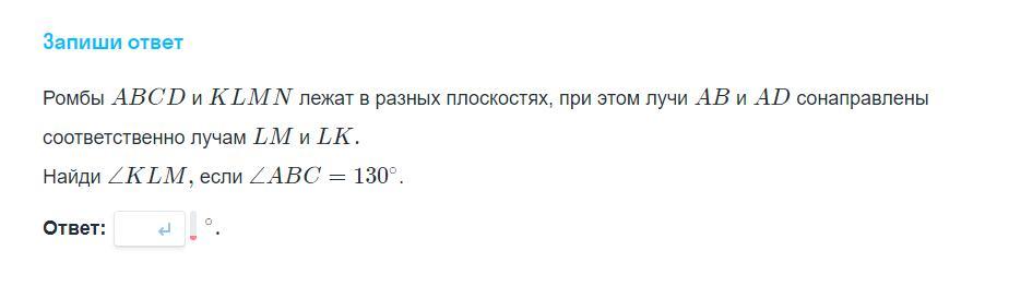 Из условия видно, что данные ромбы равны, так как равны 2 их стороны. <KLM = <BAD (соответственные углы), <BAD = 180° - 130° (<ABC) =50°