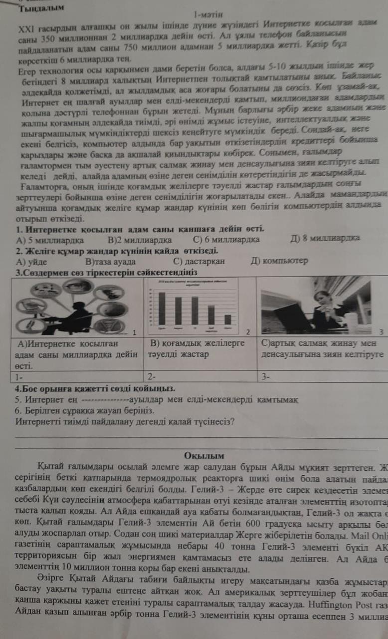 6) Интернет бізге өте тез уақытта ақпарат алып, оңай таныстық құруға көмектеседі. Қазір интернетсіз өмірді елестету қиын. Бірақ адамдар интернетті шамалан тыс көп қолданып, бос уақыттарын желідегі ойындарға, әлеуметтік желілерге қүртпау керек. Әйтпесе интернет біз үшін пайдалылығын жоғалтады.