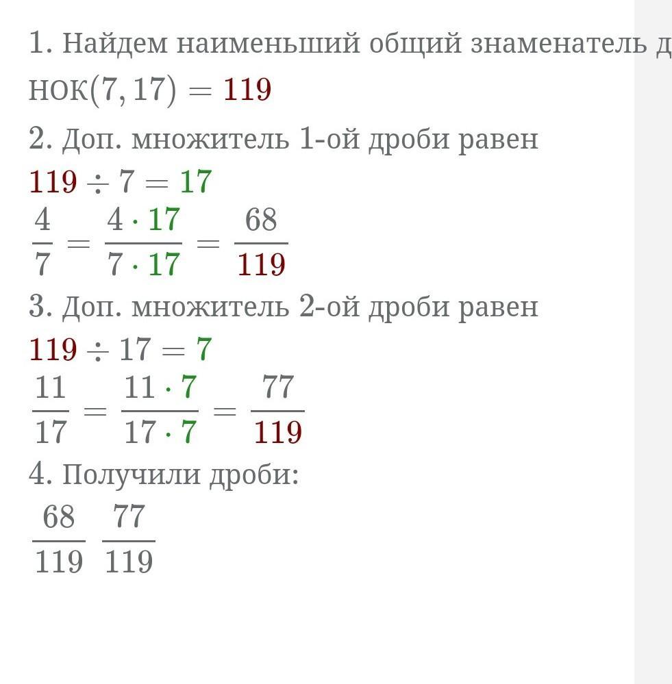 поэтому наименьший общий знаменатель: 7 × 17 = 119