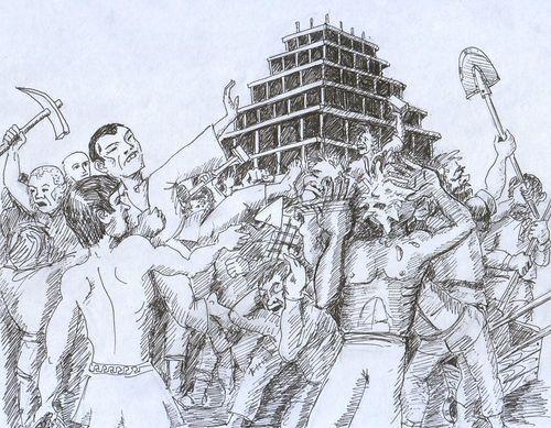 Рисованную иллюстрацию столпотворения можно увидеть ниже.