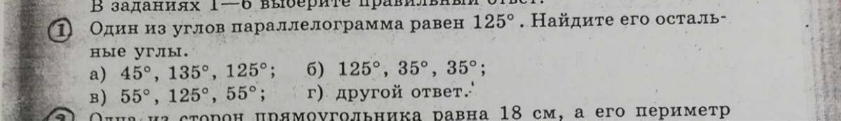Сумма углов параллелограмма 360°, нам дан 1 угол равный 125°, значит противоположный ему угол тоже будет равен 125°, значит 360-125-125=110 - сумма двух других углов, значит 110:2=55° каждый другой угол