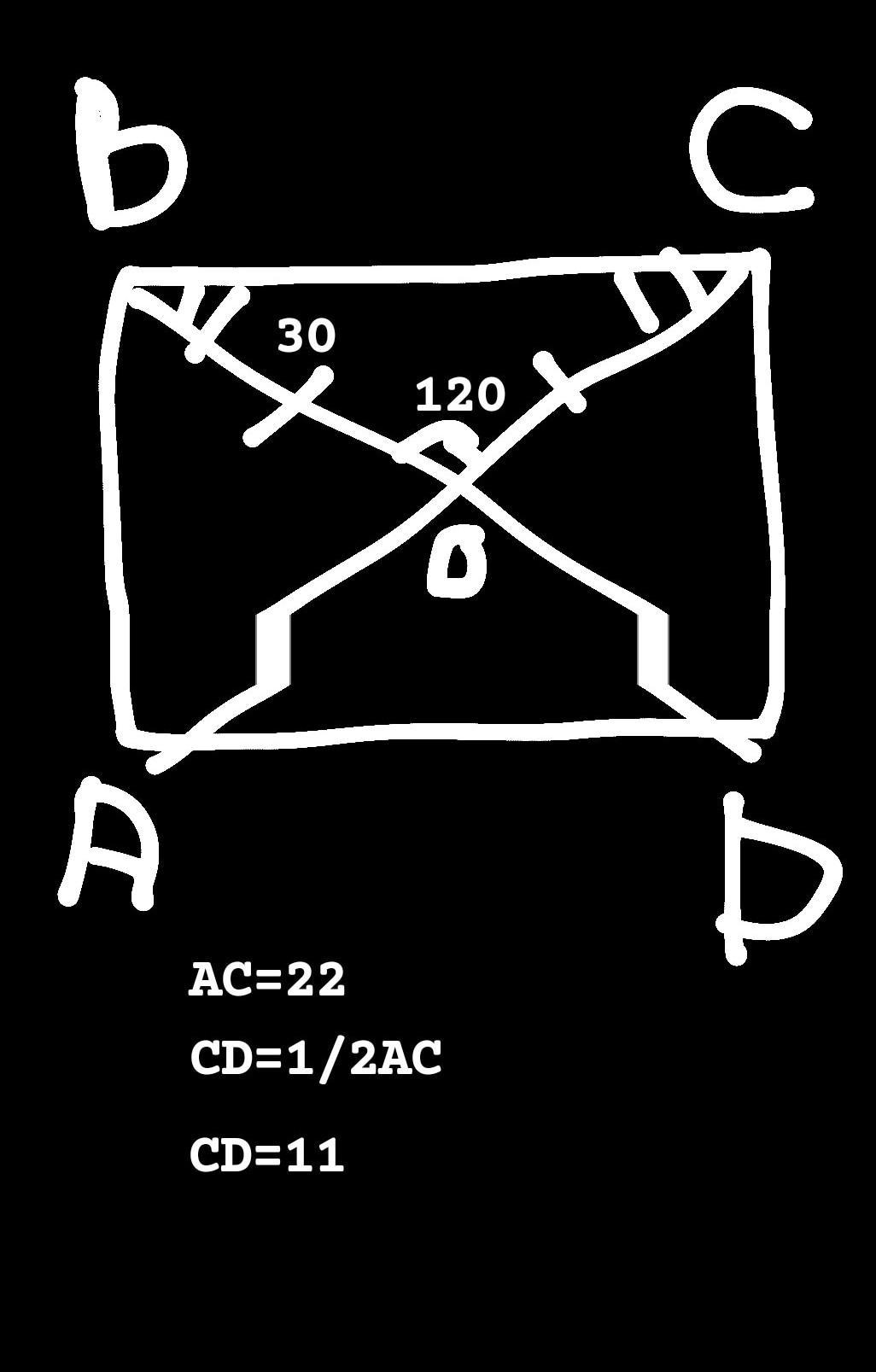 діагоналі прямокутника рівні. точкою перетину діляться навпіл. тому BOC рівнобедрений. кути при основі рівні. тому кут CBO 30°. за властивістю кута тридцять градусів в прямокутному трикутнику. катет що лежить напроти кута 30° дорівнює половині гіпотенузи з трикутника BCD.