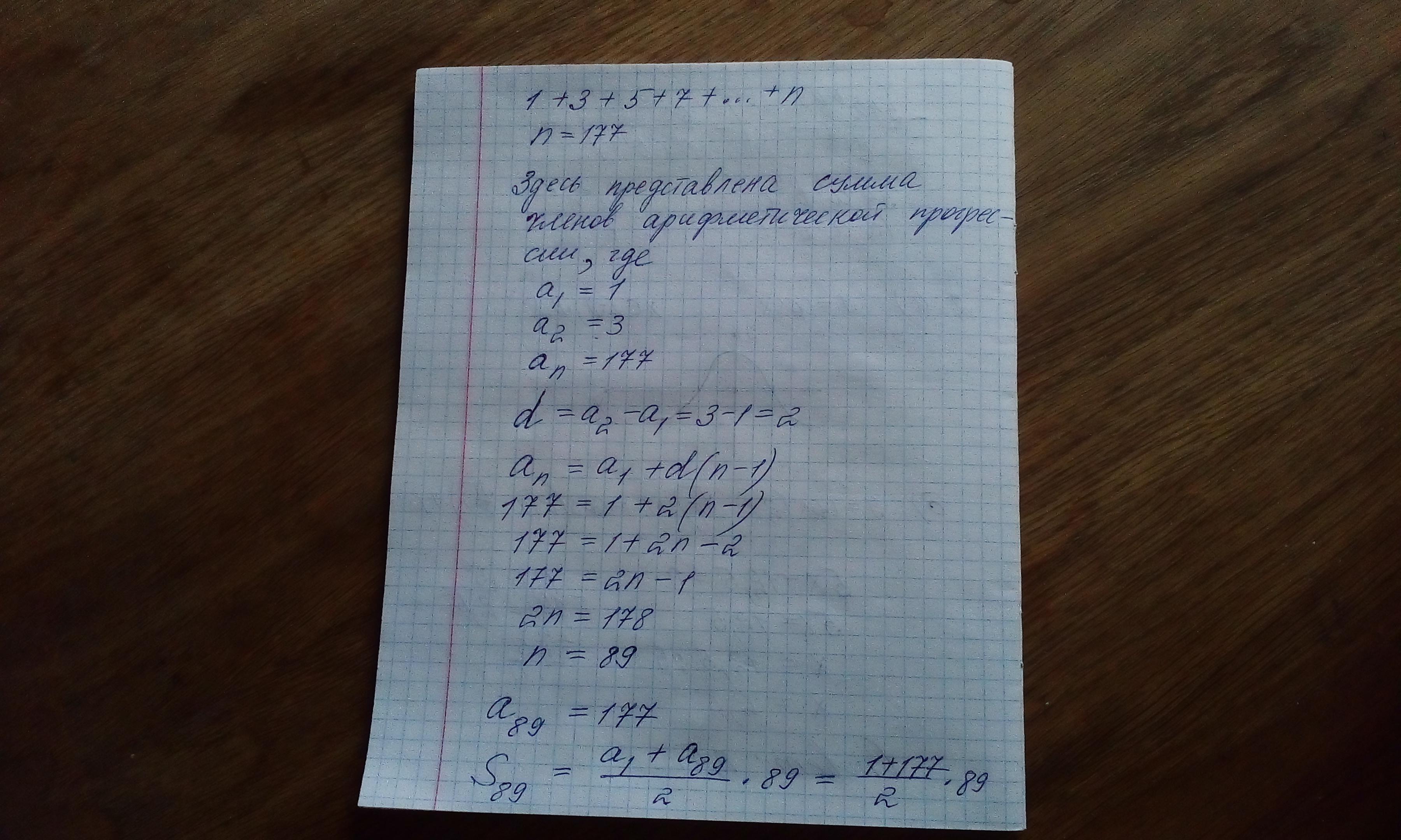 Нужна помощь. Найди сумму всех чисел последовательности: 1+3+5+7+...+n, если известно, что n=177.
