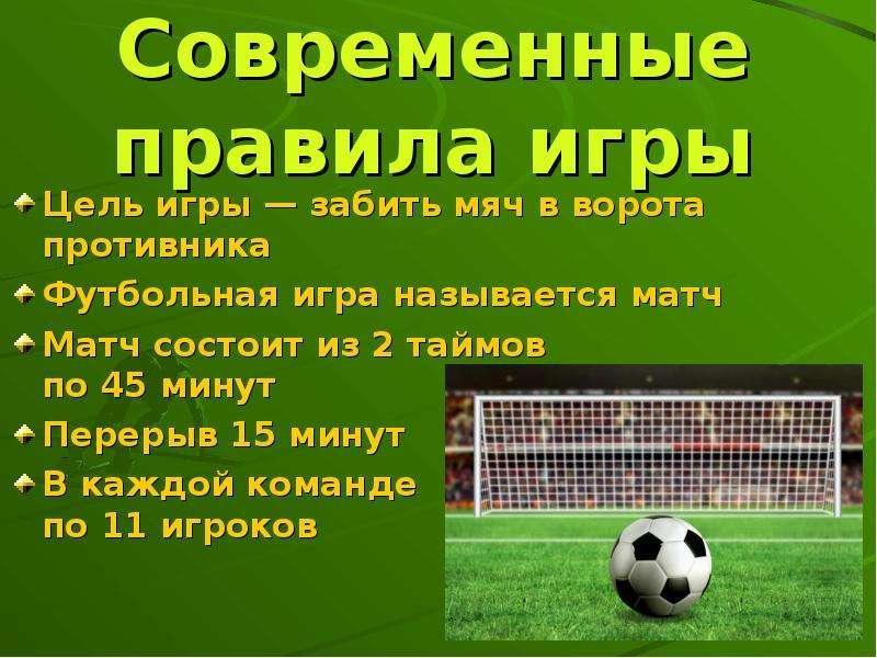 Цель игры – забить как можно больше мячей в ворота соперника. Футбольный матч всегда состоит из 2 таймов по 45 минут с перерывом в 15 минут. Судья может назначить дополнительное время после каждого из периодов, равное затраченному ранее на замены, оказание медицинской помощи или в случае умышленного затягивания.