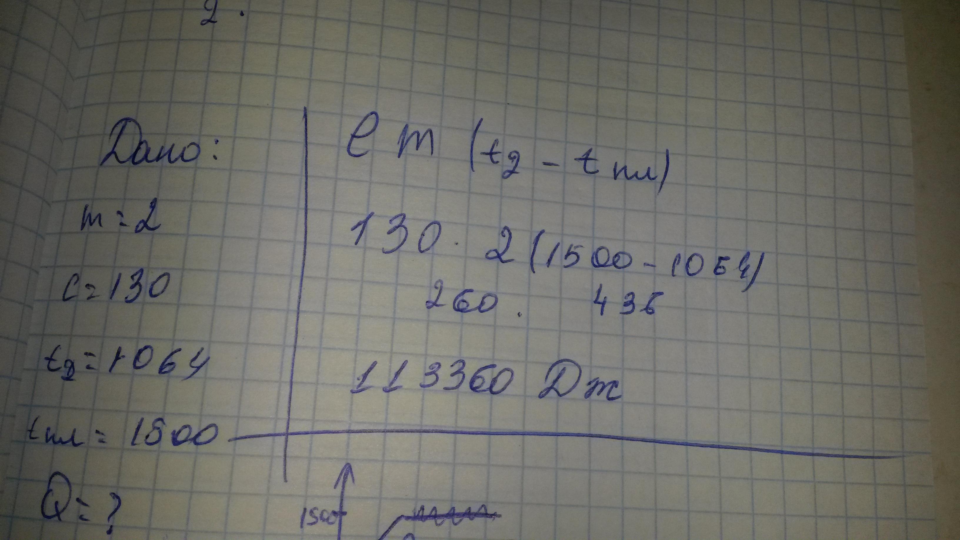 Cm(t1-t2) 130*2 (1500-1064)= 113360дж c-130 tплавления-1500
