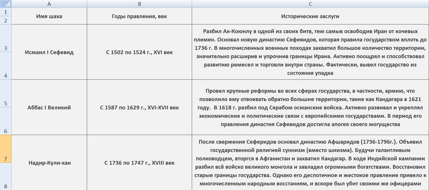 Заполните таблицу. Запишите имена 3 иранских шейхов в период с XVI по XVIII века, укажите даты их правления и не менее 2