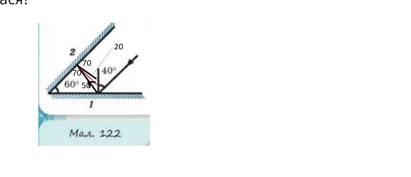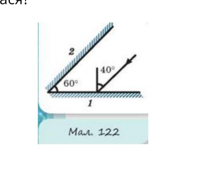 Промінь падає на дзеркало 1 так, як показано на малюнку 122. Визначте кут відбивання променя від дзеркала 2.
