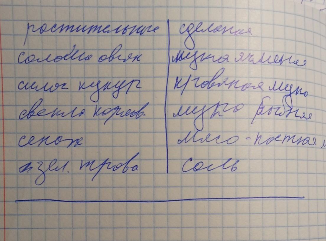 В хозяйстве на данный момент имеются следующие корма: солома овсяная, силос кукурузный, свекла кормовая, сено луговое, отруби пшеничные, сенаж, мука ячменная, соль поваренная, кровяная мука, мел, обрат, мука рыбная, зелёная трава, мясо-костная мука. Проклассифицируйте указанные корма.