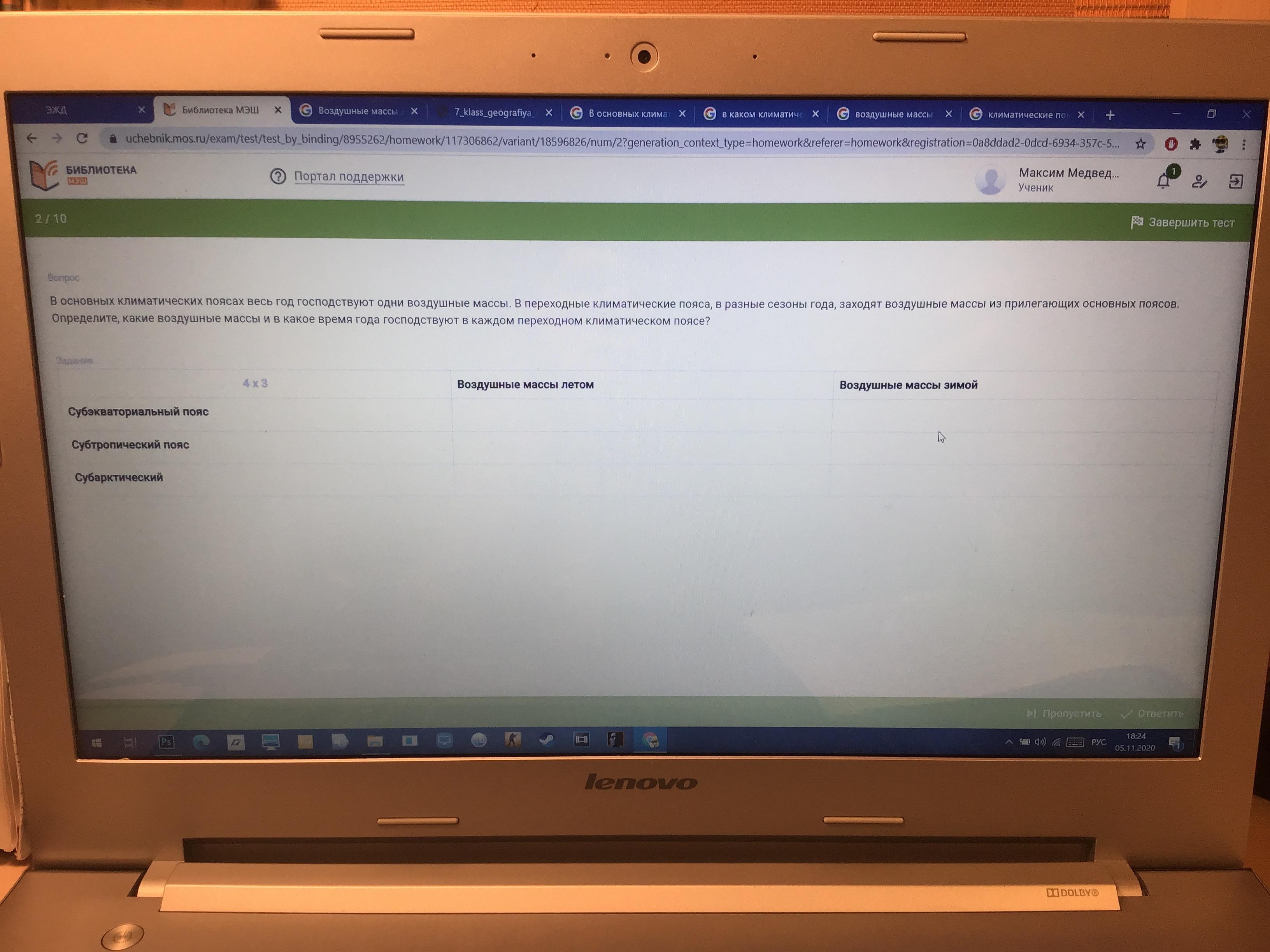 В основных климатических поясах весь год господствуют одни воздушные массы. В переходные климатические пояса, в разные сезоны года, заходят массы из прилегающих основных поясов. Определите, какие воздушные массы и в какое время года господствуют в каждом переходном климатическом поясе?
