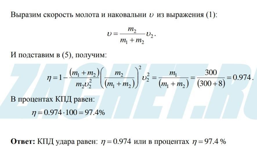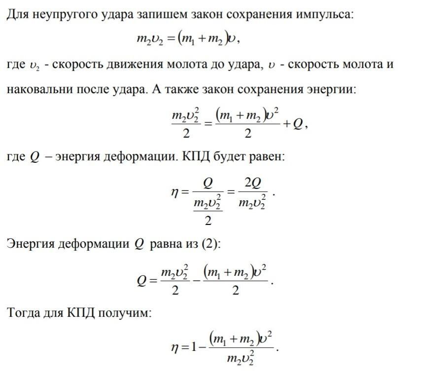 По небольшому куску мягкого железа, лежащему на наковальне массой m1 = 300 кг, ударяет молот массой m2 = 8 кг. Определить КПД η удара, если удар неупругий. Полезной считать энергию, затраченную на деформацию куска железа