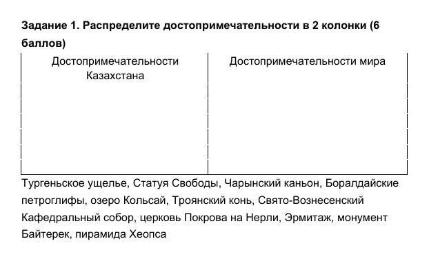 в первой колонке (Казахстан) : Тургеньское ущелье, Чарынский каньон, Боралдайские петроглифы, озеро Кольсай, свято-вознесенский кафедральный собор, монумент Байтерек.