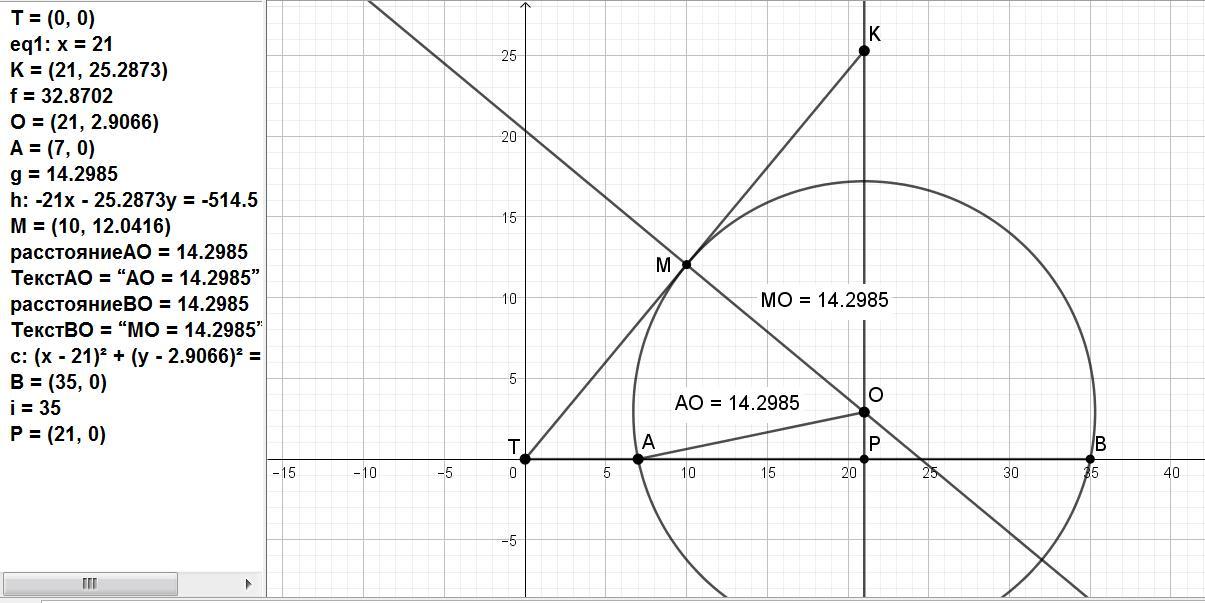 Центр О окружности находится на прямой х = (7 + 35)/2 = 21.