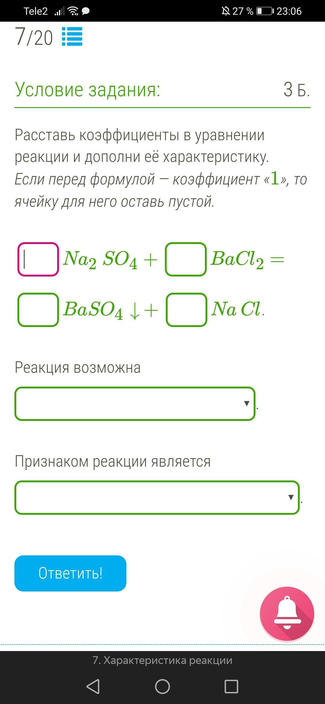 Расставь коэффициенты в уравнении реакции и дополни её характеристику.