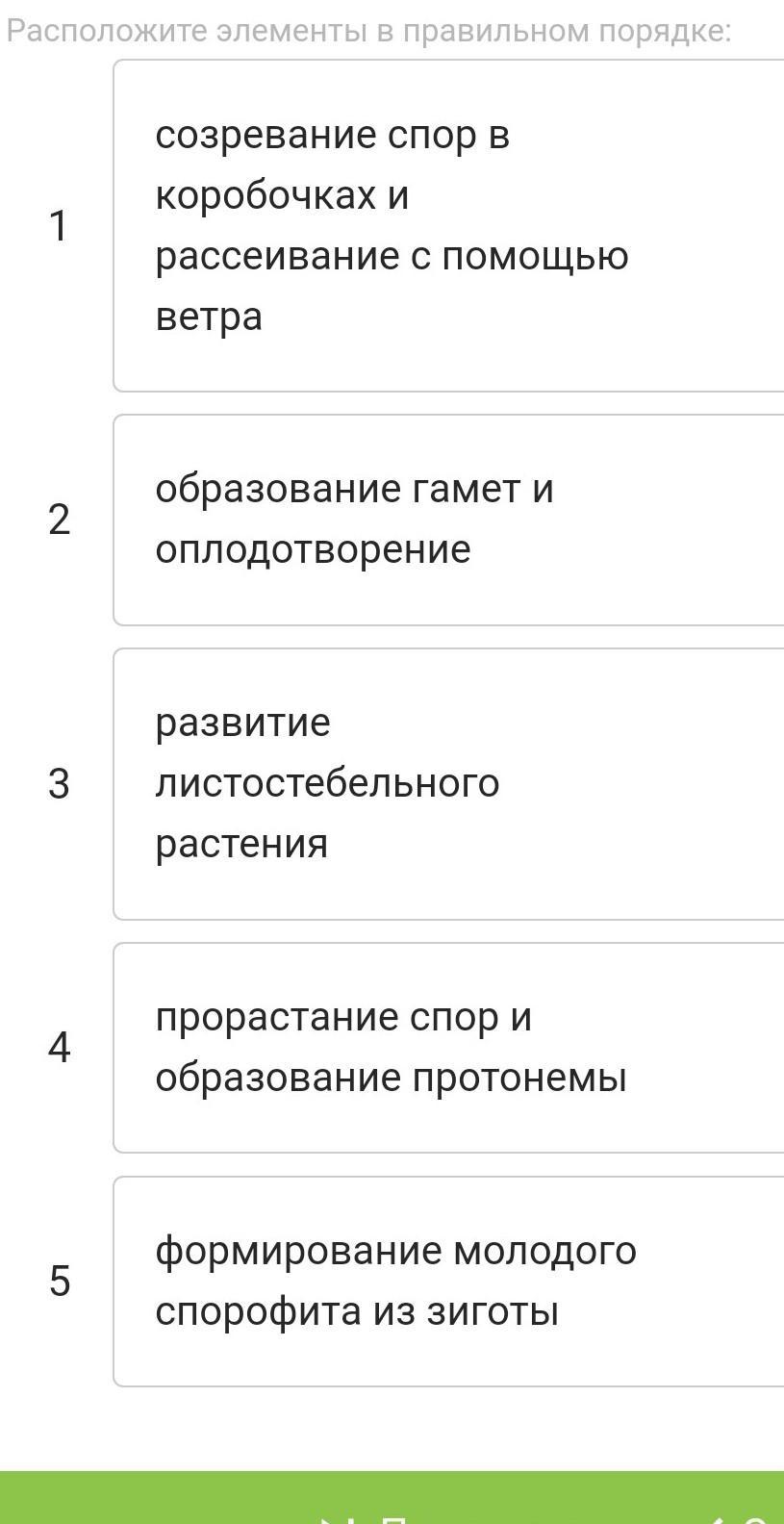 Восстановите последовательность этапов в жизненном цикле мха, начиная с созревания спор в коробочках.