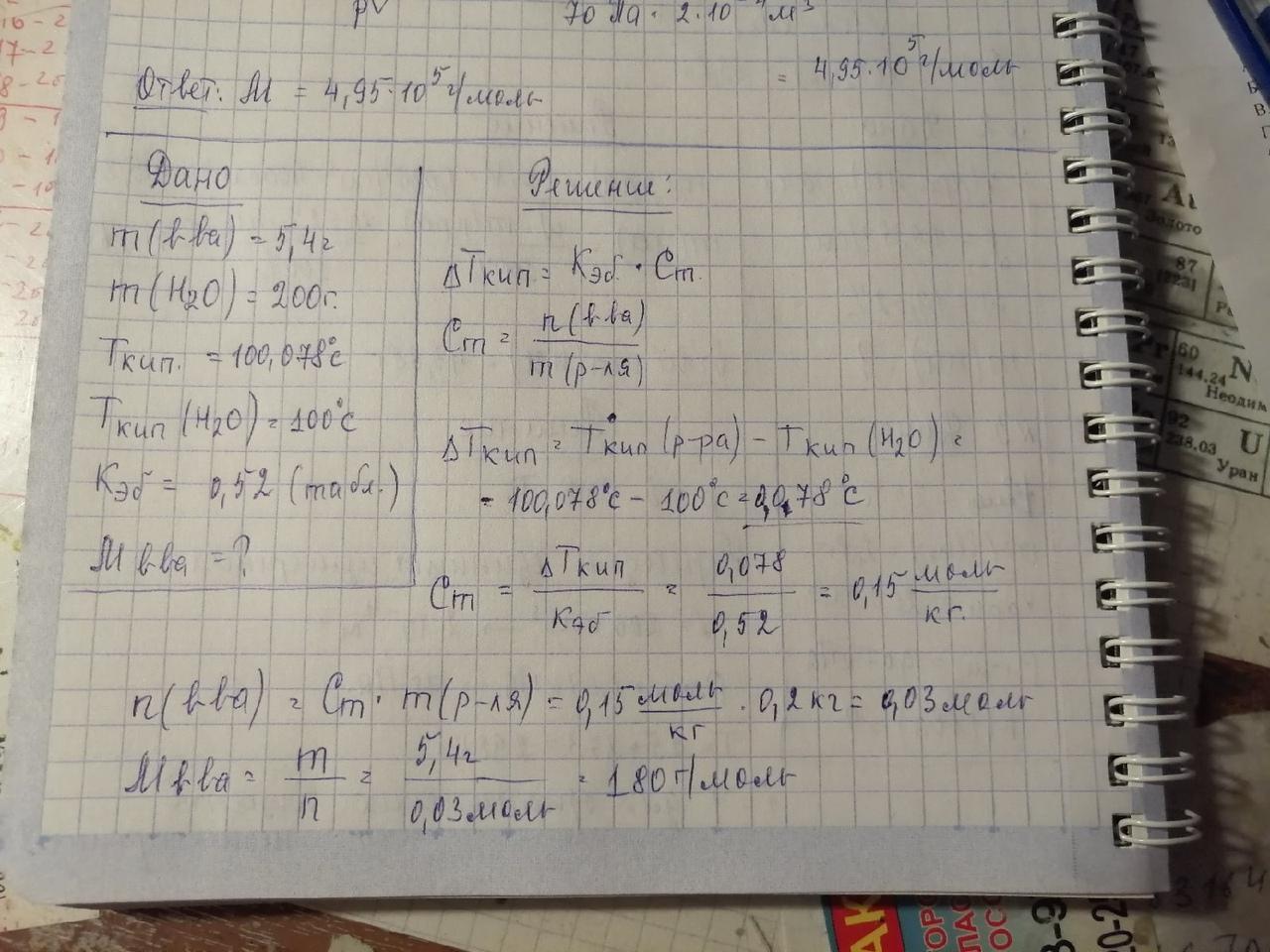 Раствор, содержащий 5,4 г неэлектролита в 200 г воды, ки-пит при 100,078 оС. Вычислите мольную массу растворенного вещества. 28 г/моль