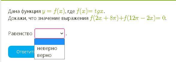 1. В задании дана функция y = f(x). Вид данной функции f(x) определен дополнительным равенством f(x) = tgx. По требованию задания докажем равенство f(2 * x + 2 * π) + f(7 * π – 2 * x) = 0. По сути говоря, нам необходимо доказать равенство tg(2 * x + 2 * π) + tg(7 * π – 2 * x) = 0, чем и будем заниматься в дальнейшем.