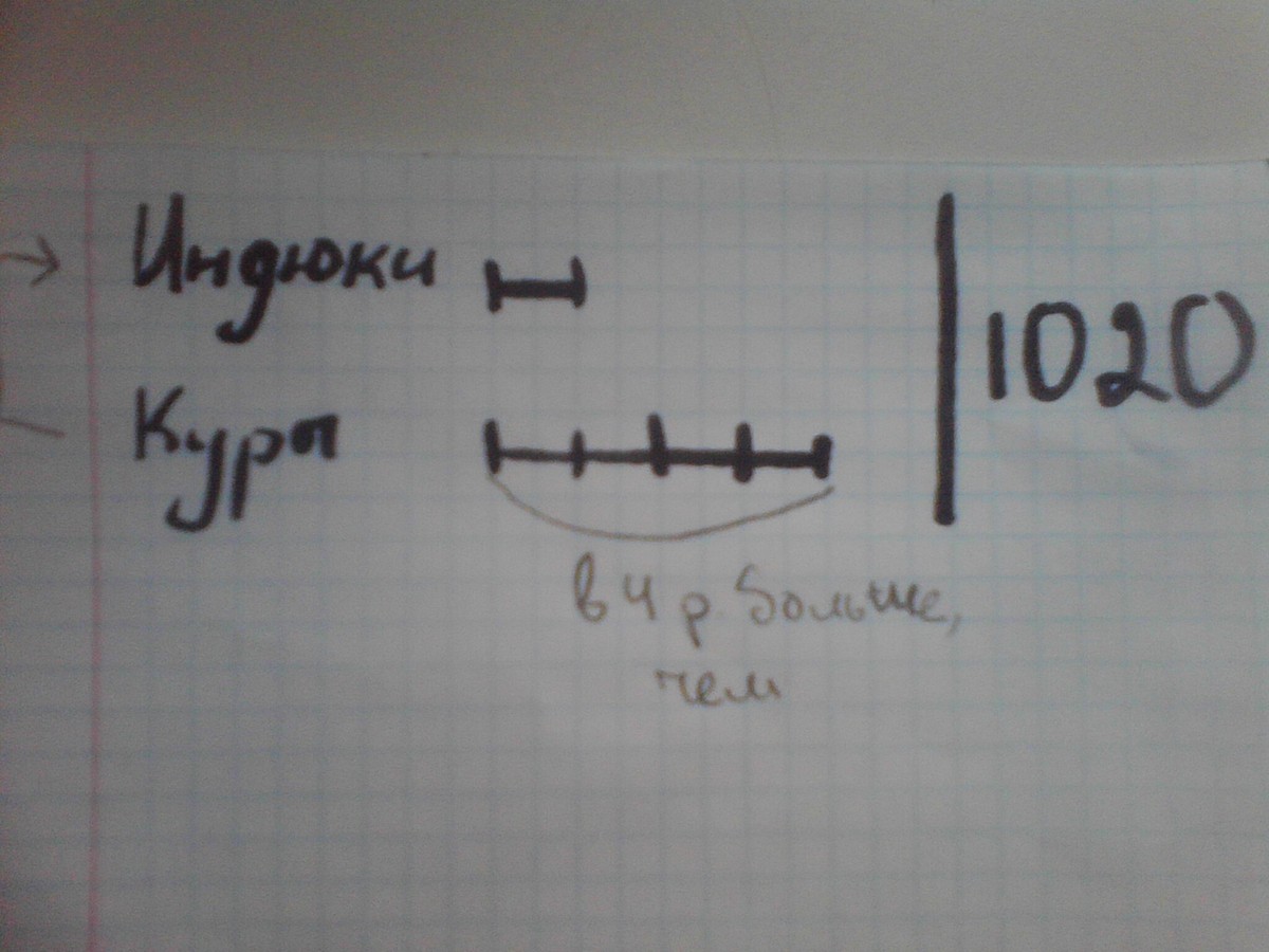Кур на птицеферме в 4 раза больше чем индюков.Всего 1020 голов.Сколько всего индюков?Сколько кур?