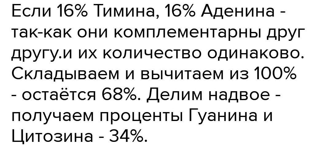 в 1 молекуле ДНК содержится 16% тимина от общего количества. определите количество (в %) каждого из остальных нуклеотидов.