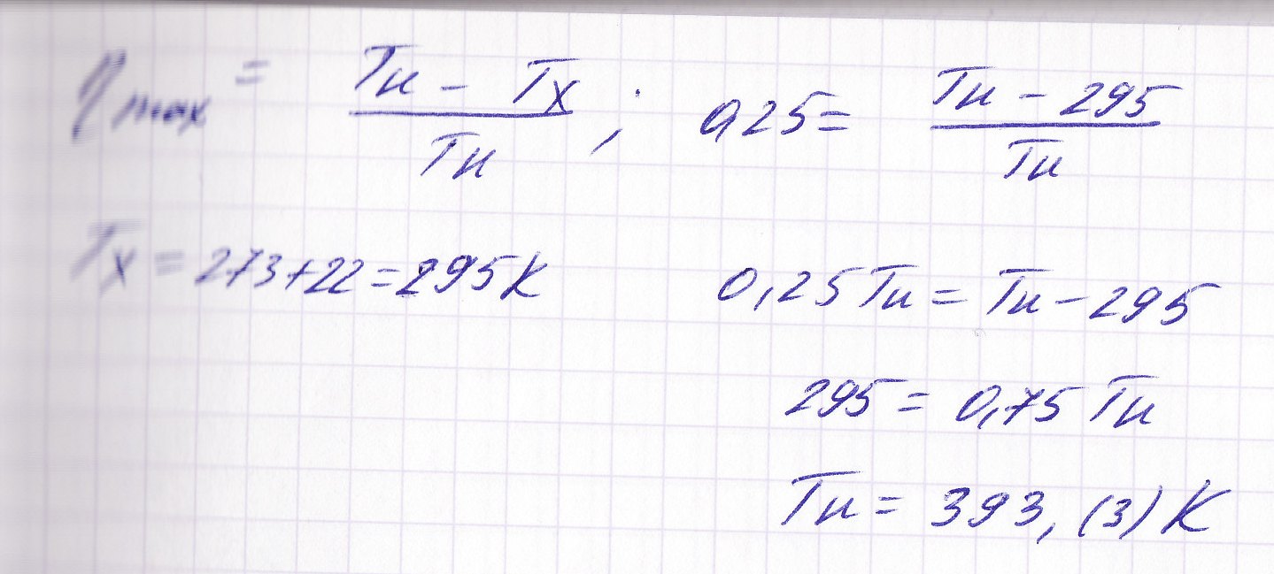 КПД идеальной тепловой машины 25%. Какова температуранагревателя если температура холодильника 22 С